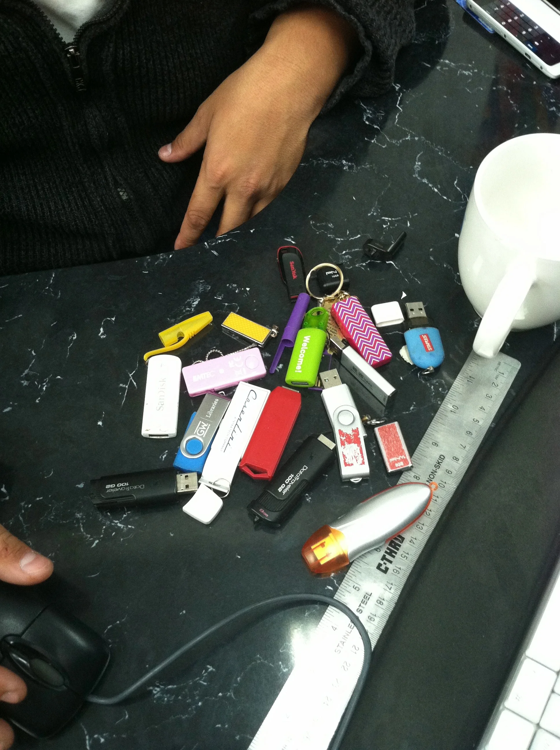 Midtown, NYC. A print shop owner shows his collection of forgotten USB drives.